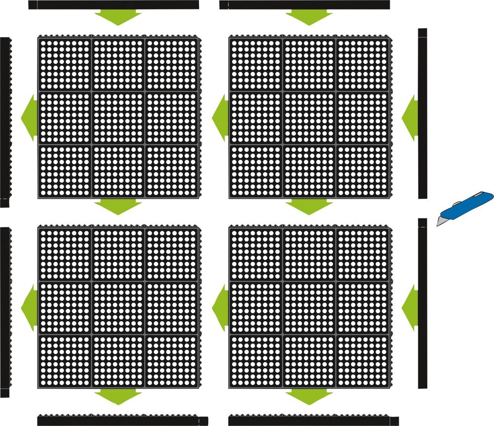 • In Verbindung mit Leisten und Ecken ist der Bodenbelag befahrbar (Sackkarren, Handwagen etc.)