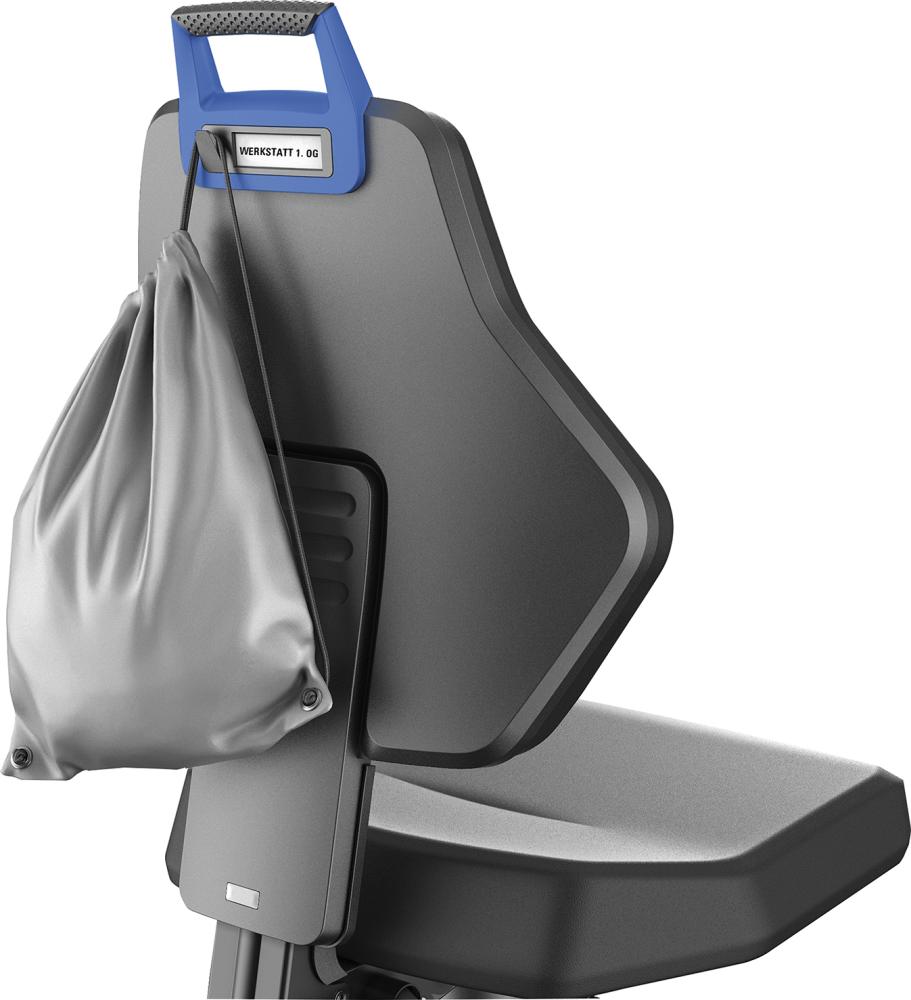 • Multifunktionsgriff: blau, mit Haken und Beschriftungsfeld zur eindeutigen Identifizierung des Stuhles (Unternehmensbranding, Bereichszuordnung, Personalisierung etc.)