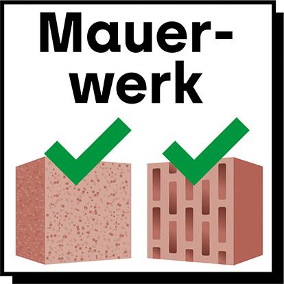 • Für Lochstein, Vollstein, Beton und Porenbeton, Kalksand-Vollstein, Kalksand-Lochstein und Hohlblockstein aus Leichtbeton zugelassen