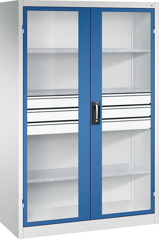 Schwerlastschrank, mit Flügeltüren und Schubladenblock mittig, RAL 7035/5010