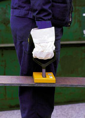 Die magnetische Handtrageklaue wird beim waagerechten und senkrechten Stahlblechtransport eingesetzt. Außerdem kommt sie beim Abheben von Blechen vom Stapel, Herausziehen von Blechtafeln aus Regalen oder Transport von flächigen Teilen aus magnetisierbarem Stahl zum Einsatz.