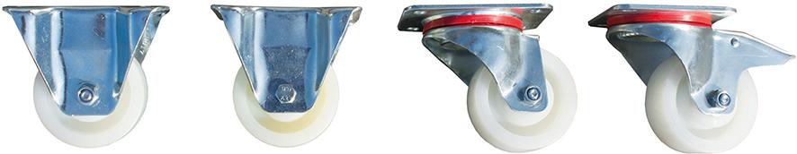 Dieser Rollensatz besteht aus 2 Lenk- und 2 Bockrollen aus Polyamid (1 Lenkrolle mit Feststeller), Ø 100 mm.