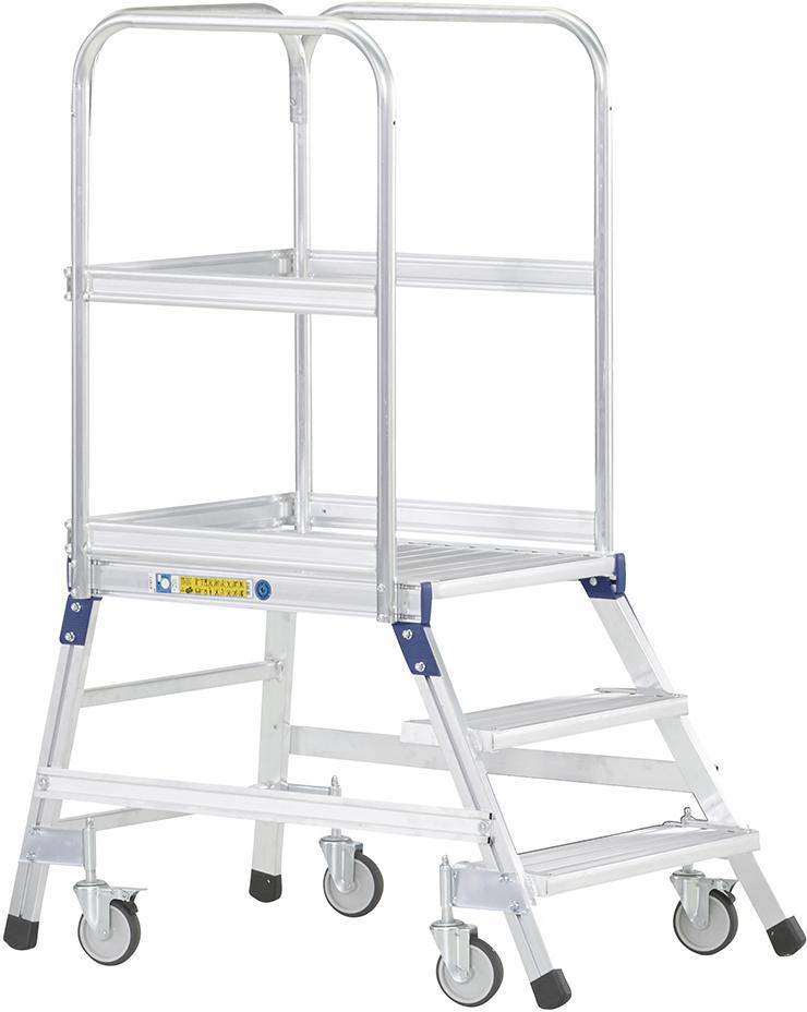 • Arbeitsplattform: geriffelt, 600 x 800 mm, mit dreiseitigem Sicherheitsgeländer (Höhe 1000 mm)