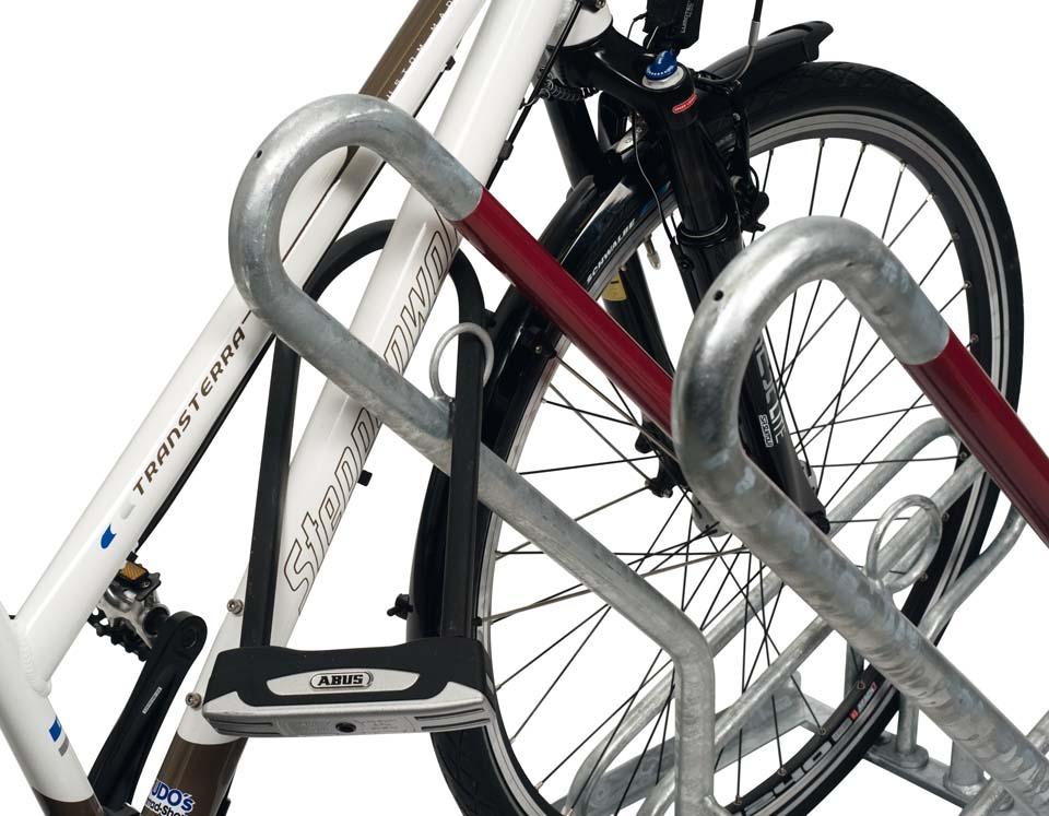 An den Anlehnparker können Fahrräder abwechselnd in Tief-/Hocheinstellung platzsparend abgestellt werden. Der funktionelle Anlehnbügel schützt das Fahrrad gegen mutwilliges Umdrücken. • Material: verzinktes Rundrohr • Optimale Diebstahlsicherung durch Befestigungsmöglichkeit an integrierten Stahl-Rundösen • Radabstand: 540 mm • Höhendifferenz: 200 mm • Radeinstellung: zweiseitig • Stellraumtiefe Radstellung 90°, zweiseitig: ca. 3200 mm • Lieferung: inklusive Bodenmontagewinkel (XBF Modell) Info: Vorbereitet zur Reihenverbindung und Bodenbefestigung Bügelabstand für Reifenbreite bis 55 mm.
