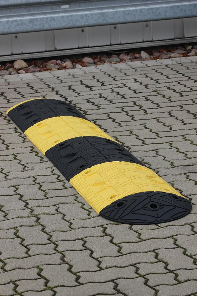 Aus Neugummi sind diese Fahrbahnschwellen gefertigt. Die Einzelteile sind selbstverbindend. • Richtgeschwindigkeit: <=max. 20 km/h • Farbe: schwarz/gelb • Mittel- und Endstücke in gelb aus durchgefärbtem Elastomer, so bleibt die gelbe Farbe dauerhaft im Einsatz erhalten • 1 Reflektor je Seite • Gewicht je Meter: 22 kg • Ohne Befestigungsmaterial