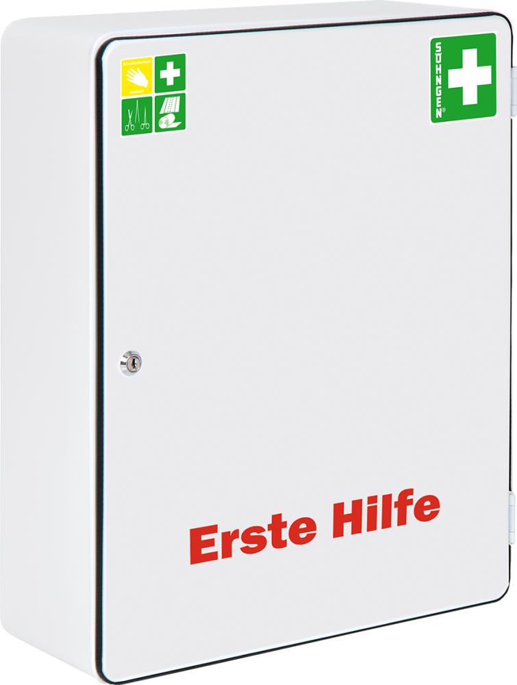 Die Kastenwagen sind serienmäßig mit einem Zentralbremssystem ausgestattet. • Winkelstahl-Konstruktion: mit Rohr-Schiebegriff • Böden: 1 fest, 4 variable Böden zum Einlegen im Raster 100 mm • Bodenmaterial: Sandwich-Platten, tragfähig, biegesteif, Oberflächen Buchendekor • Tragkraft: 90 kg pro Boden • Etagenhöhen: 285, 575, 875, 1175, 1475 mm • Etagenabstand: licht 280 mm • Rollen: 2 Bockrollen, 2 Lenkrollen mit TOTALSTOP- Zentralbremssystem serienmäßig an den Lenkrollen, gemäß der Europäischen Norm EN 1757-3 (Sicherheit von Plattformwagen). • Räder: Elastic-Vollgummi-Bereifung • Naben: Kugellager • Pulverbeschichtung • Garantie: 10 Jahre Dieser Sanitätsschrank aus Qualitätsfeinblech dient zur Aufbewahrung einer Krankentrage. Der Schrank verfügt über ein Sicherheits-Zylinderschloss, zwei Schlüssel sowie ein Notschlüsselfach in der Türmitte. • Farbe: orange • Inhalt: Krankentrage (1 x klappbar), Rettungssitz und Rettungstuch, Erste-Hilfe-Koffer Quick-CD Norm DIN 13157, Zwei Orion-Reflex-Allzweckschutzdecken, Taschenlampe mit Rot-Grün-Filter