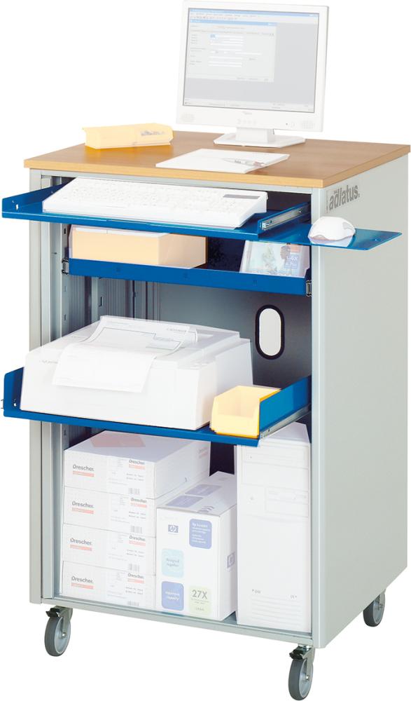 Diese Computer-Stationen gibt es in mobiler und stationärer Ausführung. Sie haben eine Werkbankplatte in Buche-Dekor. • Plattenstärke: 25 mm • Unterbau oben: mit Tastaturauszug, BxT 590x350, inklusive links oder rechts ausziehbarer Mausauflage, Verschluss mittels abschließbaren Querrollladen • Unterbau unten: mit Auszugsschublade und Auszugsboden, Tragkraft 35 kg, Auszug 100 %, Einbauhöhe verstellbar, Verschluss mittels abschließbaren Querrollladen • Energieversorgung: 4-fach mit Ein-/Ausschalter und Zuleitung • Kabeldurchlässe: Tischplatte, Rückwand, Innenteil • Umweltfreundliche Pulverbeschichtung: RAL 7035 lichtgrau, RAL 5010 enzianblau Ausstattungsoptionen: • Mit Monitorgehäuse Maße BxTxH: 720x300x710 mm Monitorfach: Maße innen BxTxH 705x280x530 mm inklusive integriertem Ventilator mit Filtermatte, Belüftung, Staubschutz Mit Sichtfenster: Maße BxH: 545x495 mm, abschließbar Offenes Ablagefach: Höhe 140 mm, unter dem Monitorfach Lieferung: Komplett montiert.