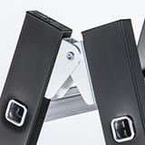 Die Schwerlastleiter ist mit geriffelten Breitsprossen für ein ermüdungsfreies Stehen ausgestattet. • Robuste Stahlscharniere • Perlongurt-Spreizsicherung • Sprossen-Holm-Verbindung: mit hochfester ZARGES Qualitäts-Bördelung • Sprossen, Holme: Alu-Stangenprofil • Holme schwarz eloxiert, 60 mm tief • Auswechselbar: Kunststoffschuhe für einen rutschsicheren Stand und festen Sitz am Holm • Entspricht der Norm EN 131 professional