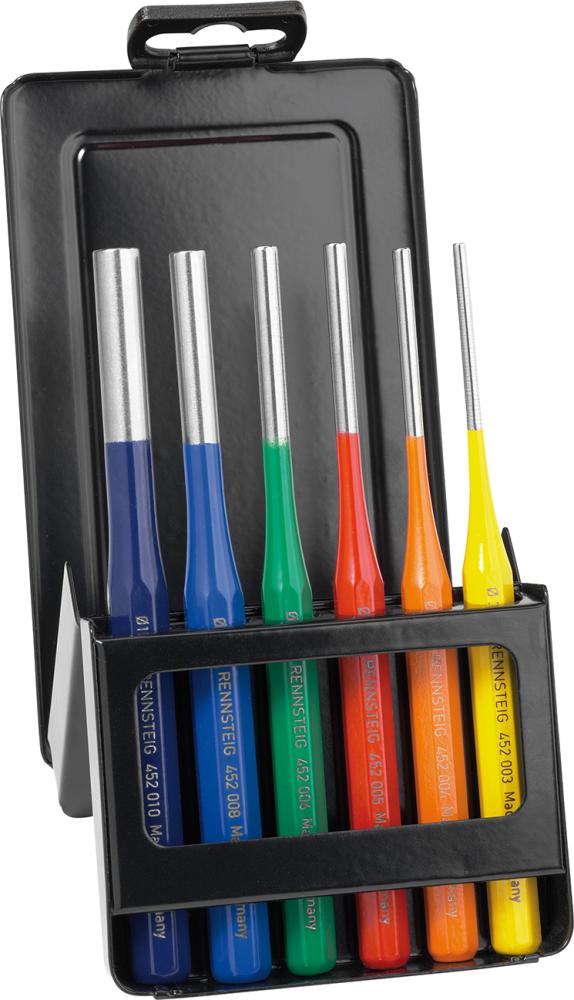• Schaft 8-kant • Zylindrische Dornform • Werkzeugstahl, extrahart (59 HRC) • Arbeitsende mit Sicherheitsschlagkopf • Unterschiedliche Farben erleichtern die Zuordnung der Durchmesser Lieferung: In Metallkassette. Inhalt: 6 Splintentreiber 3; 4; 5; 6; 8; 10 mm.