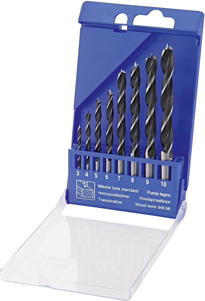 • Zentrierspitze • Vorschneiderartig wirkende Schneiden • Rechtslaufend • Schaft zylindrisch • Für alle Arbeiten in Weich- und Hartholz geeignet Lieferung: In Kunststoffkassette. Inhalt: 8 Holzspiralbohrer 3; 4; 5; 6; 7; 8; 9; 10 mm.
