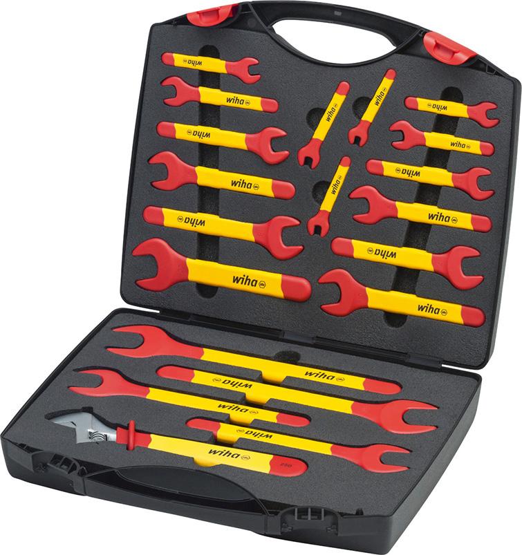 • Maulstellung 15° • Isoliert bis 1000 V nach IEC 60900 / DIN EN 60900 • Sichere Installation von Klemmen und Muffen, Leiteranschlüssen, Verschrauben von Stromschienen • Für Arbeiten im Bereich von spannungsführenden Teilen bis 1000 V AC Lieferung: Im Kunststoffkoffer. Inhalt: 19 VDE-Einmaulschlüssel 6; 7; 8; 9; 10; 11; 12; 13; 14; 15; 16; 17; 18; 19; 22: 24; 27; 30; 32 mm 1 VDE-Rollgabelschlüssel 250 mm